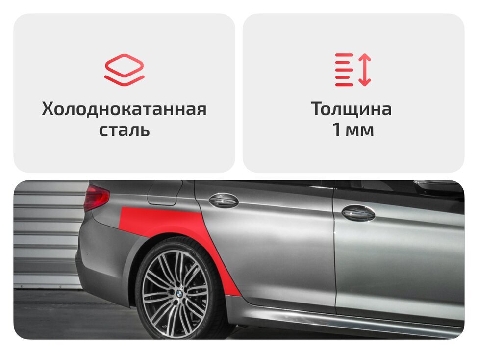 Ремкомплекты задних арок для BMW 1-серии F20/F21 предназначены для ремонта внешних арок при коррозии, а также деформации и незначительном повреждении при мелких ДТП. Заходят под дверь и в нишу заднего колеса на 1–2 см. Высота вверх по крылу около 10 см в зависимости от модели автомобиля.